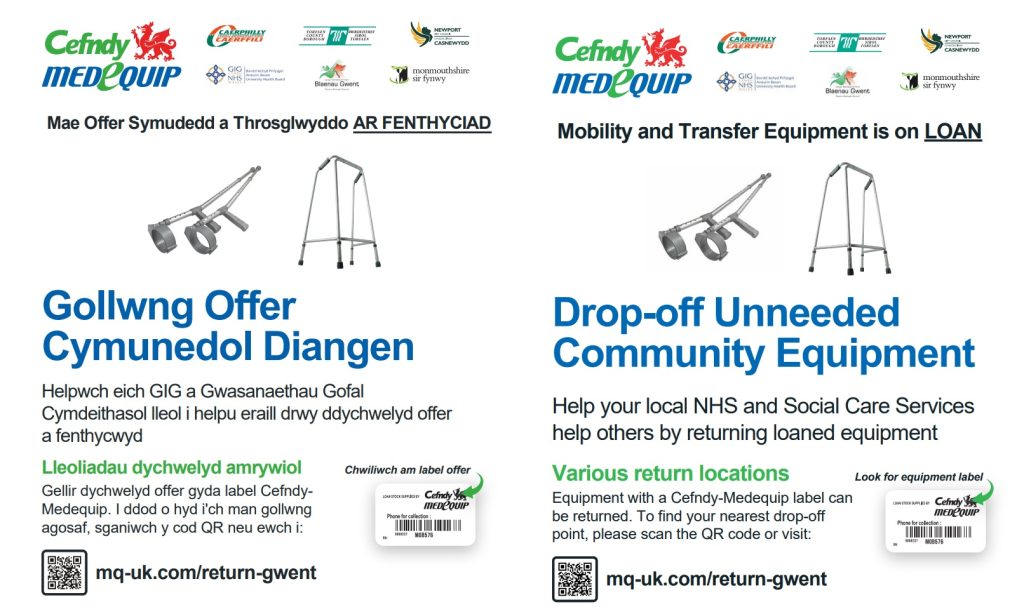 Mae’n bwysig eich bod yn dychwelyd yr holl offer gyda label GWICES, gan gynnwys unrhyw offer arbenigol fel cerddwr gyda olwynion, codwyr, cadeiriau ayyb.