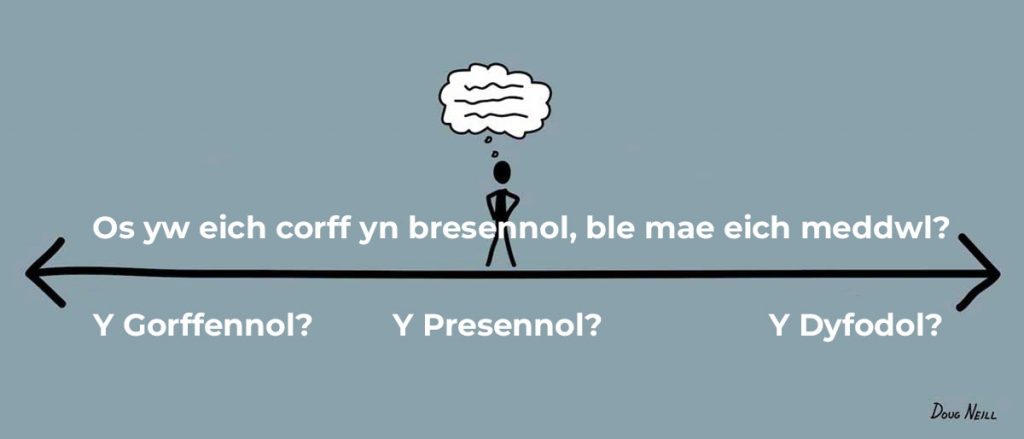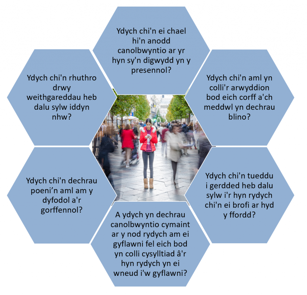 Er enghraifft: Brwsio’ch dannedd. Ble mae eich meddwl pan fyddwch chi’n brwsio eich dannedd? Talwch sylw gofalus i’r synhwyrau – y brwsh dannedd mewn perthynas â’r dannedd, blas y past dannedd, lleithder yn cronni yn y geg ac ati.